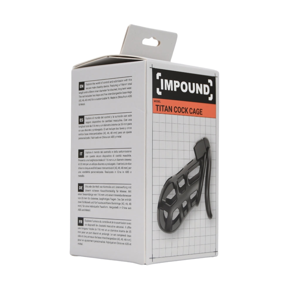 Step up your chastity game with the Impound Titan Cock Cage - a bold, breathable, and lightweight device built for both comfort and control. Featuring a sleek black design with an open-structured cage, the Titan allows for airflow and hygiene without compromising on restriction. With a total length of 116mm and an inner diameter of 35mm, it provides a snug and secure fit. Complete with three base ring sizes for a customizable experience, the Titan is crafted from 95% ABS and 5% metal - strong, stylish, and perfect for extended wear.